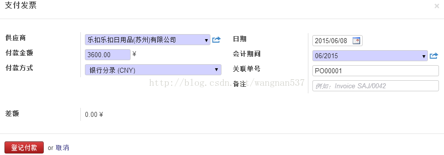 公司同意付款后,蔡文姬在供应商发票中点击付款,在弹出的支付窗口中选择实际的付款方式(现金或银行分录),本案例选为“银行分录”,然后点击登记付款。