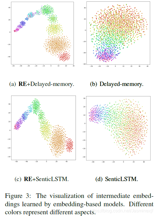 可视化部分,本文使用了 t-SNE 对模型学习到的方面向量表示中间结果进行可视化对比实验。从图 3 结果可以看出,本文提出的方法能使不同方面在训练过程中得到更好的区分,有效提升了方面向量表示的质量。