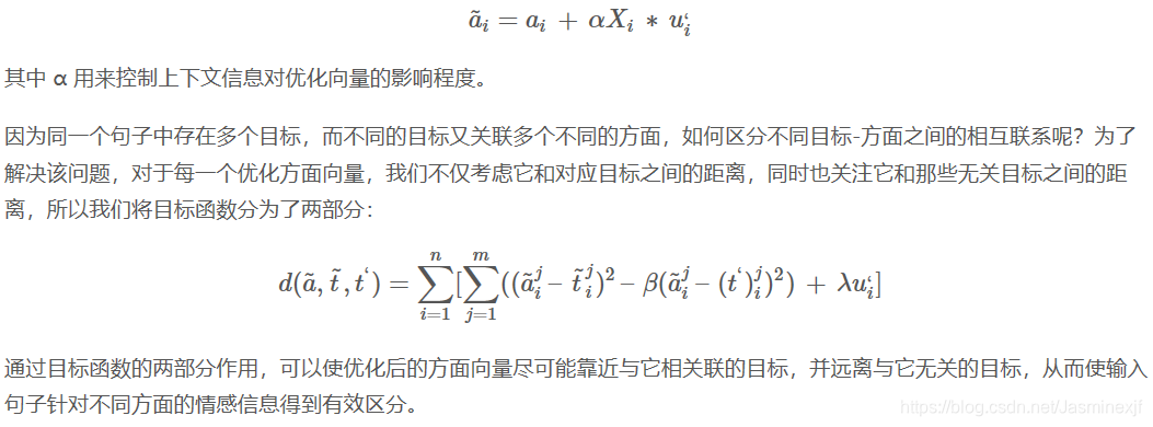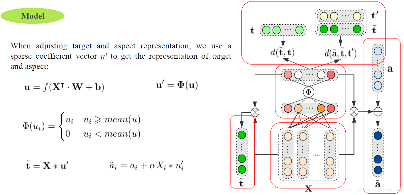 为了使目标表示从上下文中自动生成,所以我们将提取上下文中和目标有高度关联的重要词语来优化目标向量表示: