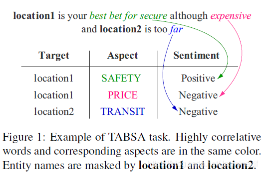 for target “location1”, the sentiment polarity is positive towards aspect “SAFETY” but is negative towards aspect “PRICE”.