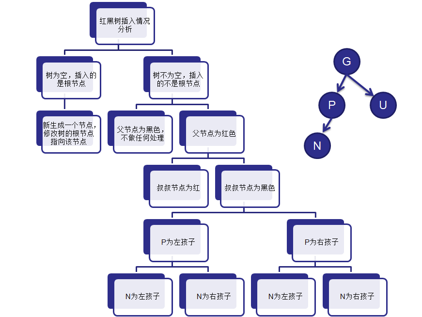 红黑树在新增节点过程中比较复杂,复杂归复杂它同样必须要依据上面提到的五点规范,同时由于规则1、2、3基本都会满足,下面我们主要讨论规则4、5。假设我们这里有一棵最简单的树,我们规定新增的节点为N、它的父节点为P、P的兄弟节点为U、P的父节点为G。