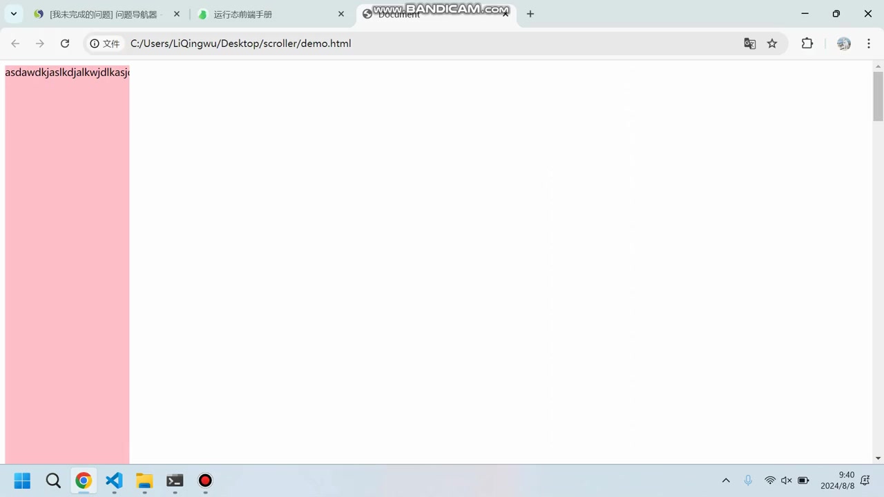 横向滚动条 css js html 1. 练习手写滚动条2. 市面上多是竖向滚动条,横向滚动条较少3. 问题复现:如果容器的内容超过了容器的宽度,就会出现横向滚动条(暂不考虑换行),但是如果该容器的高度过高,用户需要滑到容器的底部才能操作横向滚动条(横向滚动条默认在容器的底部,当然我们不考虑使用shift+鼠标左键的方式横向移动)