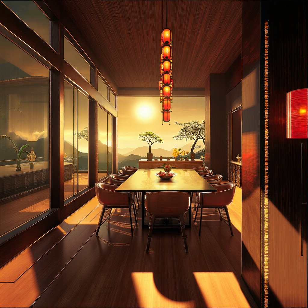 Chinese style, cyberpank dining room, full hd, cinematic,sunshine