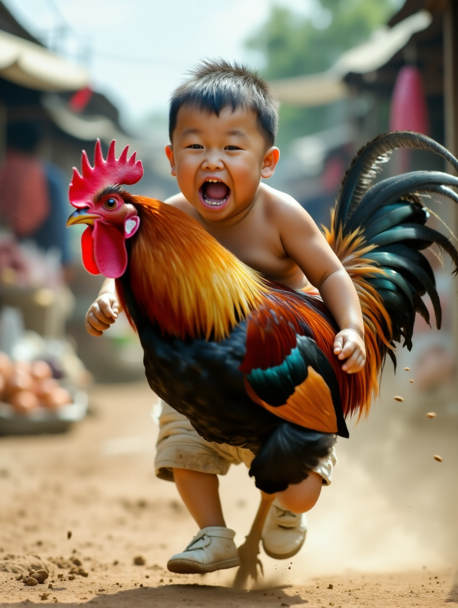 Capture an energetic scene of a chubby little boy in rural China, shirtless, chubby belly, still clinging to dirt, wearing a pair of muddy white cloth shoes on his feet, and a mischievous and happy expression on his face, running through the muddy streets of the countryside. The dust was flying, and the little boy was clutching on his arm a large, strong rooster, whose feathers were a mixture of deep Burgundy and glittering gold, in stark contrast to the boy's plain clothes. The rooster frowns slightly, but is surprisingly calm, adding a whimsical twist to the energetic chase. The background is a rural wet market. The overall tone of the film is a lively and lively atmosphere, which summarizes the free and simple youth. The sun shines through the white clouds, casting dappled shadows, and the pleasant warm picture enhances the sense of movement and the joyous chaos of the moment.