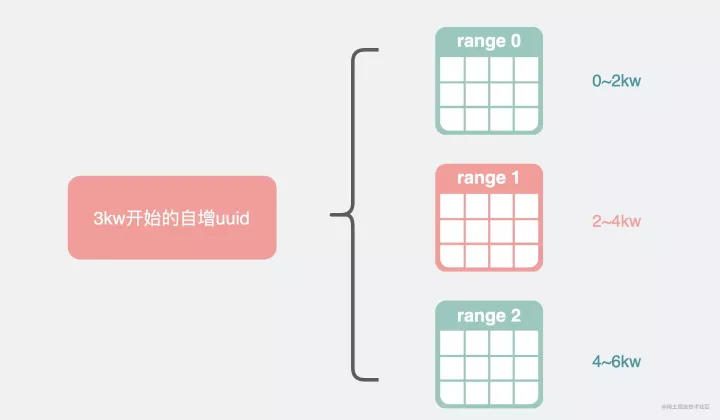 它通过引入Range的概念进行数据表分片,比如第一个分片表的id在02kw,第二个分片表的id在2kw4kw。这其实就是根据id范围进行数据库分表。