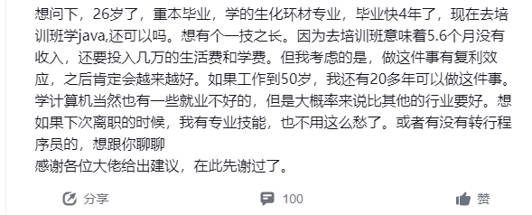 前两天逛脉脉时看见一条转行帖,一位已经毕业4年、生化环材专业的同学发帖问:26岁,非科班毕业,转行学Java晚不晚?
