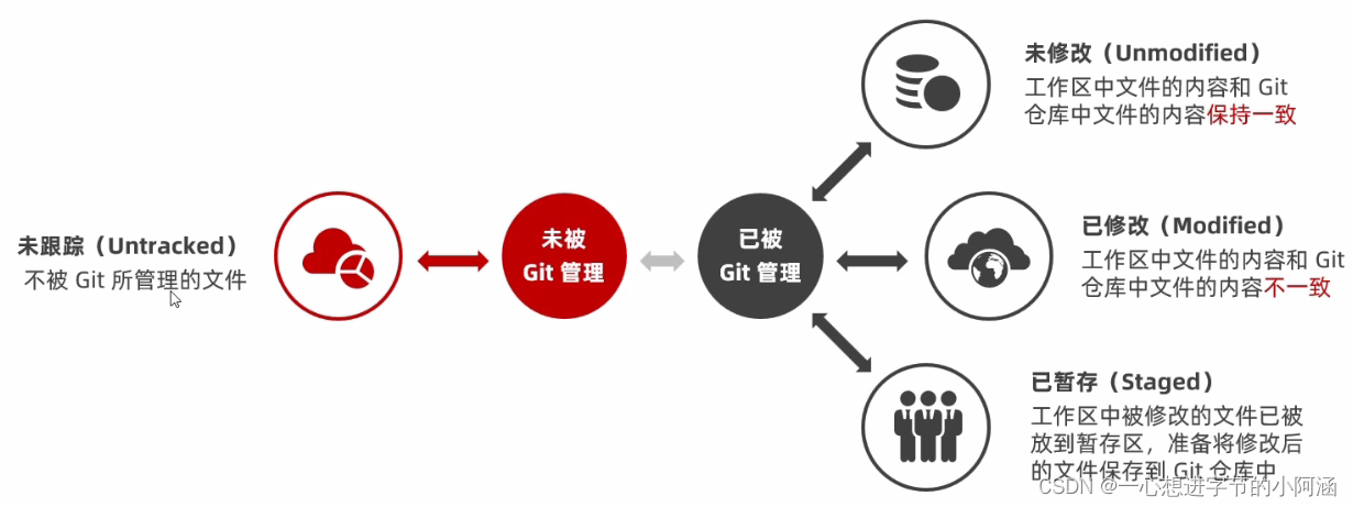 已修改 modified已暂存 staged已提交 committed安装完 Git 之后 第一件事就是设置自己的 用户名 和 邮箱配置用户信息3.检查配置信息查看所有的全局配置项查看指定的全局配置项4.获取帮助信息要想打开 git config 命令的帮助手册如果不想查看完整的手册 可以用 -h5.获取 Git 仓库的两种方式(1)将尚未进行版本控制的本地目录转换成Git仓库(2)从其他服务器克隆一个已存在的Git仓库如果自己有一个尚未进行版本控制的项目目录,想要用Git来控制它,