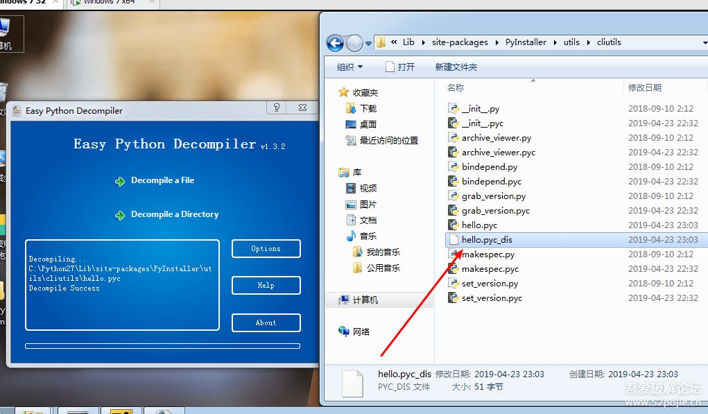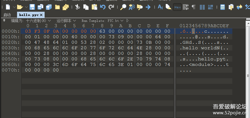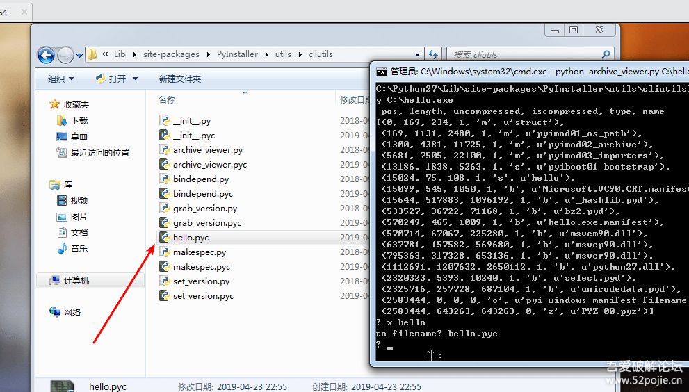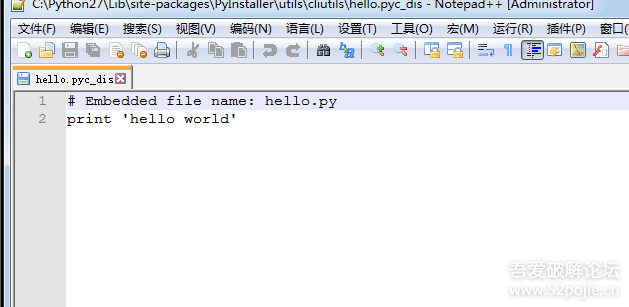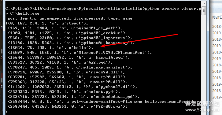 接下来我们将这个hello world的exe反编译成python源码,这需要两个步骤,首先由exe获取pyc文件,再由pyc获取py文件。