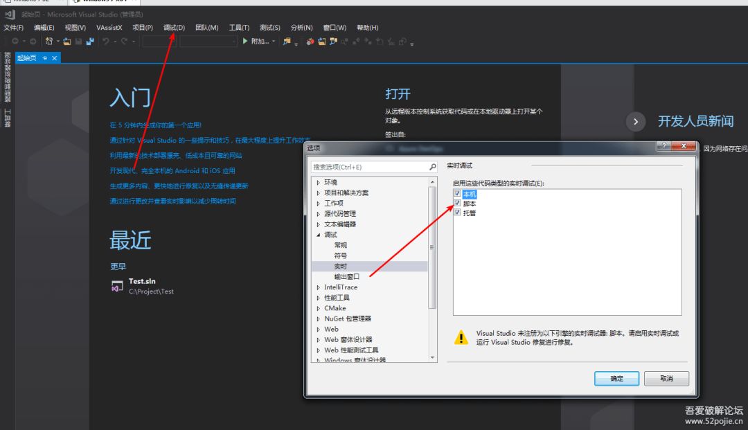 首先用管理员方式启动VS,接着选择调试->选项,把脚本前面的勾给打上