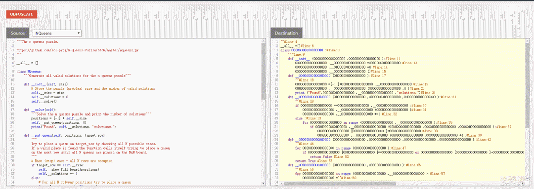 python代码的混淆相对会比较简单,只是单纯利用宏替换的原理修改变量和函数名,这个网站是目前用的最多的python代码混淆工具:http://pyob.oxyry.com/,