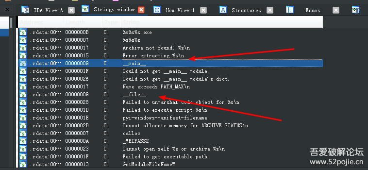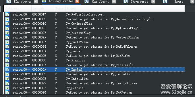 以及一堆以py开头的函数。明明只写了一个hello world,为什么会有这么多字符串呢?这是因为python是个解释型语言,pyinstaller打包的时候实际上是将python的解释器和py文件一起打包成了一个exe。所以这个字符串特征几乎是不可避免的