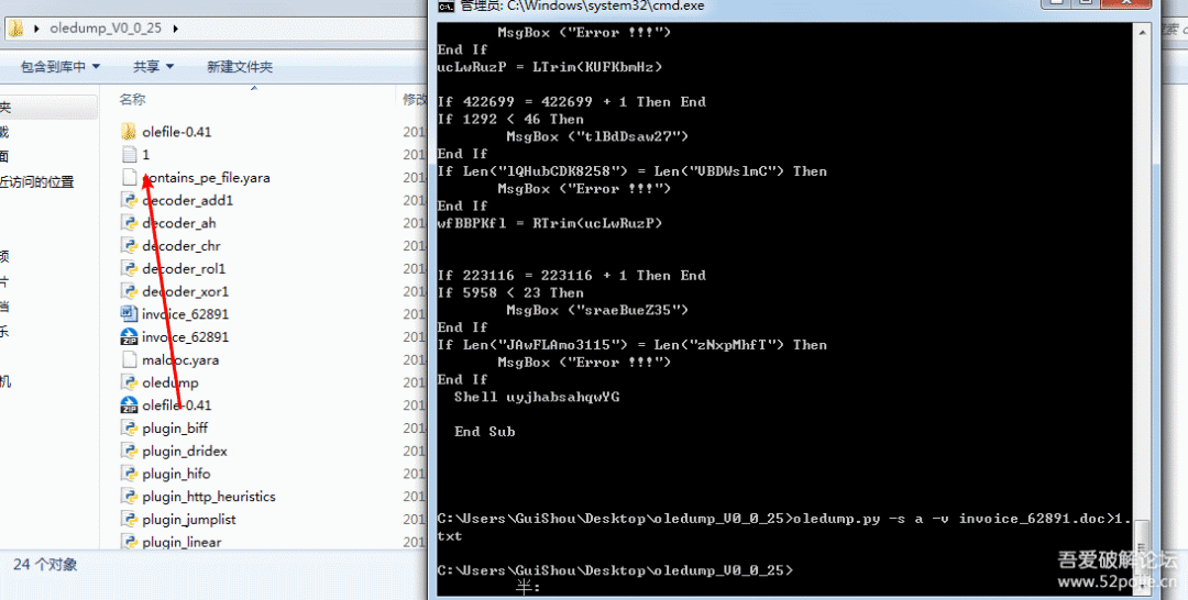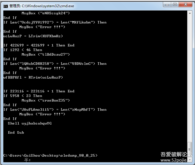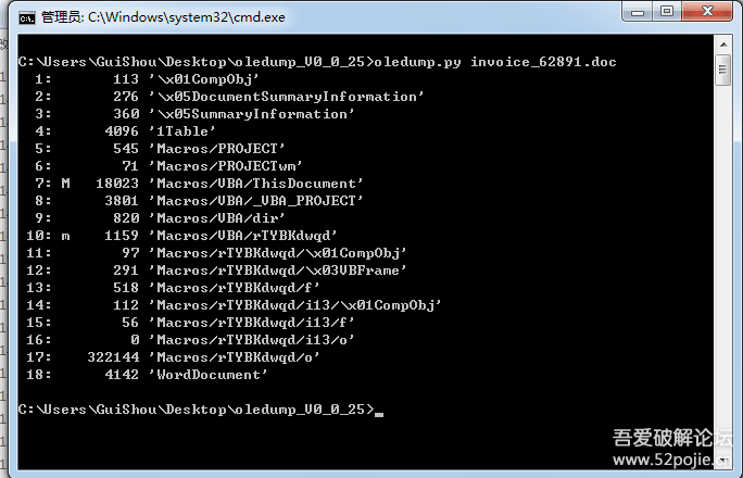 然后在此处打开命令窗口,输入下面一条命令对可执行程序进行解包分析: