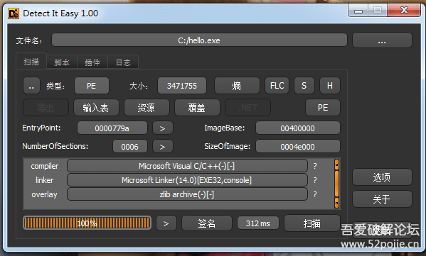可以看到hello.exe的编译器为VS14.0,这是因为python是基于VS14版本的,这也可以作为一个辨识的特征