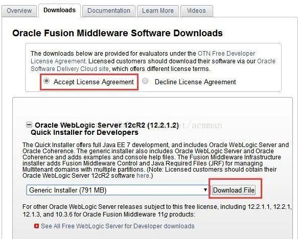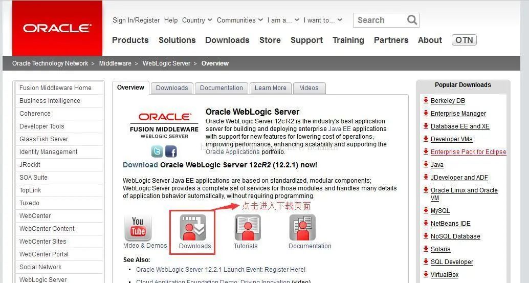 二、WebLogic下载 来到Oracle的WebLogic Server主页: http://www.oracle.com/technetwork/middleware/weblogic/overview/index.html 点击Downloads: