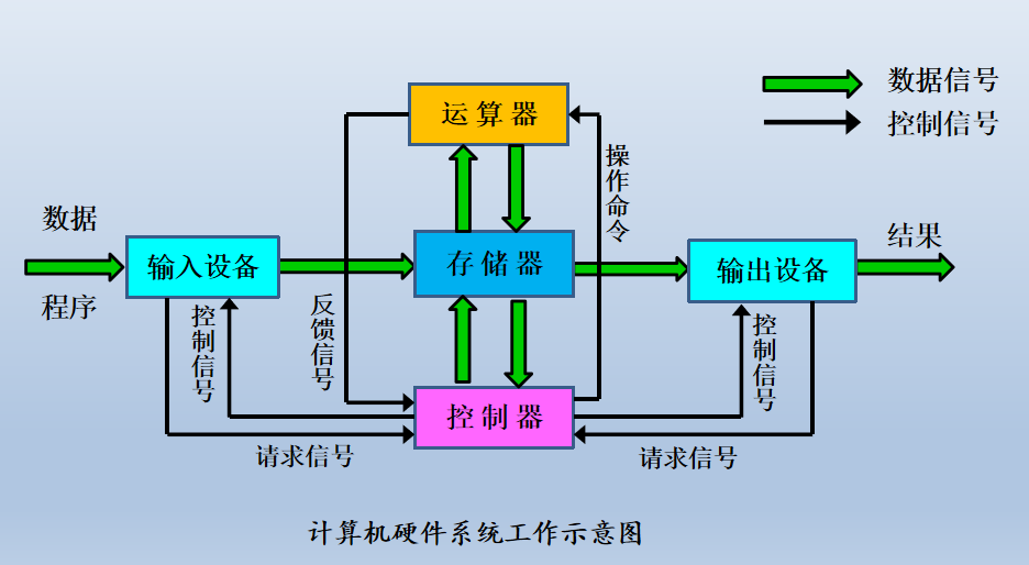 基本的计算机硬件系统由运算器、控制器、存储器、输入设备和输出设备5大部件组成。随着器件技术和微电子技术的发展,运算器、控制器等部件已被集成在一起,统称为中央处理单元(Central Processing Unit,CPU)。CPU是硬件系统的核心,用于数据的加工处理,能完成各种算术、逻辑运算及控制功能。