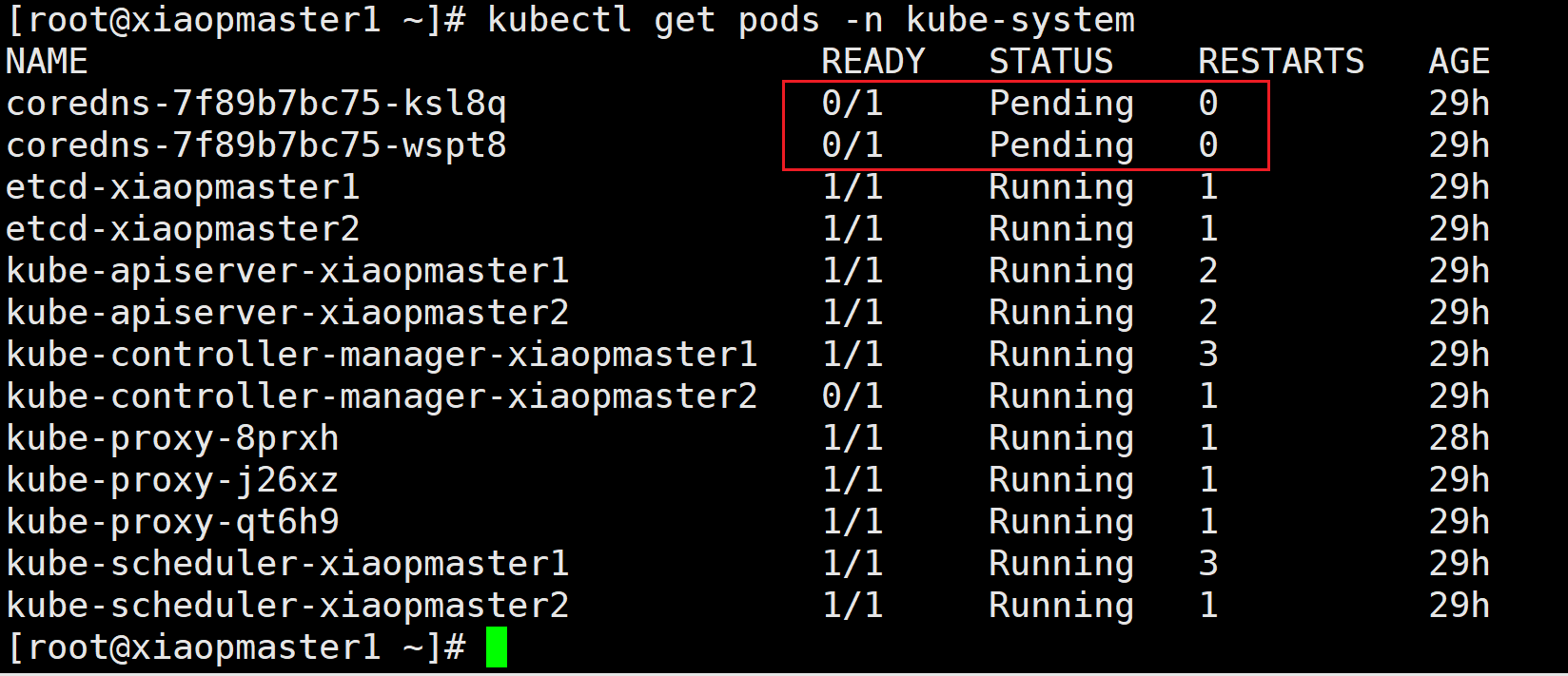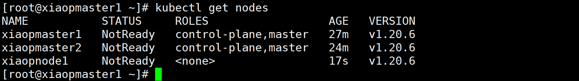 kubectl get nodes因为master2也是主节点##master2 cd /root && mkdir -p /etc/kubernetes/pki/etcd &&mkdir -p ~/.kube/ ##master1传证书文件 scp /etc/kubernetes/pki/ca.crt xiaopmaster2:/etc/kubernetes/pki/ scp /etc/kubernetes/pki/ca.key xiaopmaster2:/etc/kubernetes/pki/ scp /etc/kubernetes/pki/sa.key xiaopmaster2:/etc/kubernetes/pki/ scp /etc/kubernetes/pki/sa.pub xiaopmaster2:/etc/kubernetes/pki/ scp /etc/kubernetes/pki/front-proxy-ca.crt xiaopmaster2:/etc/kubernetes/pki/ scp /etc/kubernetes/pki/front-proxy-ca.key xiaopmaster2:/etc/kubernetes/pki/ scp /etc/kubernetes/pki/etcd/ca.crt xiaopmaster2:/etc/kubernetes/pki/etcd/ scp /etc/kubernetes/pki/etcd/ca.key xiaopmaster2:/etc/kubernetes/pki/etcd/##master1查看加入节点命令 kubeadm token create --print-join-command kubeadm join 192.168.200.199:16443 --token 8evotb.xs3fs22e6ssinlxm \ --discovery-token-ca-cert-hash sha256:16caaffcadf51d94a358bc4a121a293fcc5654c602ae121c3252687b371fb310 \ --control-plane ##--control-plane有这个的是主节点使用,没有的是工作节点使用 kubectl get nodes##添加node1节点,使用自己生成的 kubeadm join 192.168.200.199:16443 --token 8evotb.xs3fs22e6ssinlxm \ --discovery-token-ca-cert-hash sha256:16caaffcadf51d94a358bc4a121a293fcc5654c602ae121c3252687b371fb310