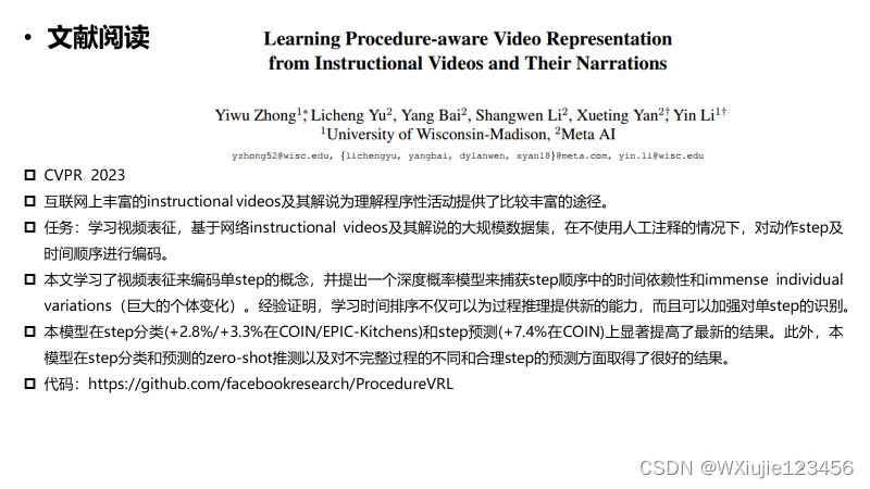 【76】论文阅读Learning Procedure-aware Video Representation from Instructional Videos and Their Narrations 在这项工作中,作者建议学习视频表征,基于网络instructional videos及其叙述的大规模数据集,在不使用人工注释的情况下,对动作步骤及其时间顺序进行编码。本模型在step分类(+2.8%/+3.3%在COIN / EPIC-Kitchens)和step预测(+7.4%在COIN)上显著提高了最新的结果。此外,本模型在step分类和预测的zero-shot推理以及对不完整过程的不同和合理步骤的预测方面取得了很好的结果。