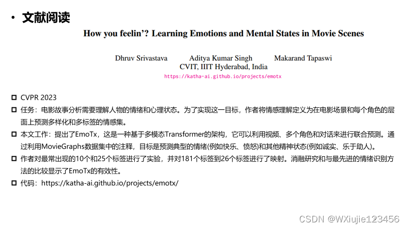 论文阅读 【79】CVPR 2023 How you feelin’? Learning Emotions and Mental States in Movie Scenes 本文工作:提出了EmoTx,这是一种基于多模态Transformer的架构,它可以利用视频、多个角色和对话来进行联合预测。通过利用MovieGraphs数据集中的注释,目标是预测典型的情绪(例如快乐、愤怒)和其他精神状态(例如诚实、乐于助人)。
