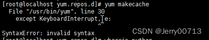 File "/usr/bin/yum", line 30 except KeyboardInterrupt, e: ^ SyntaxError: invalid syntax原因:yum需要用python2编译,如果服务器安装的是python3以上,并作为默认编译器的话,就会出现这个错误。