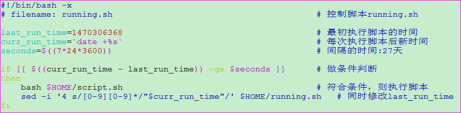 1) 每天定时执行running.sh脚本,再在脚本running.sh里面判断,当间隔时间满足条件时