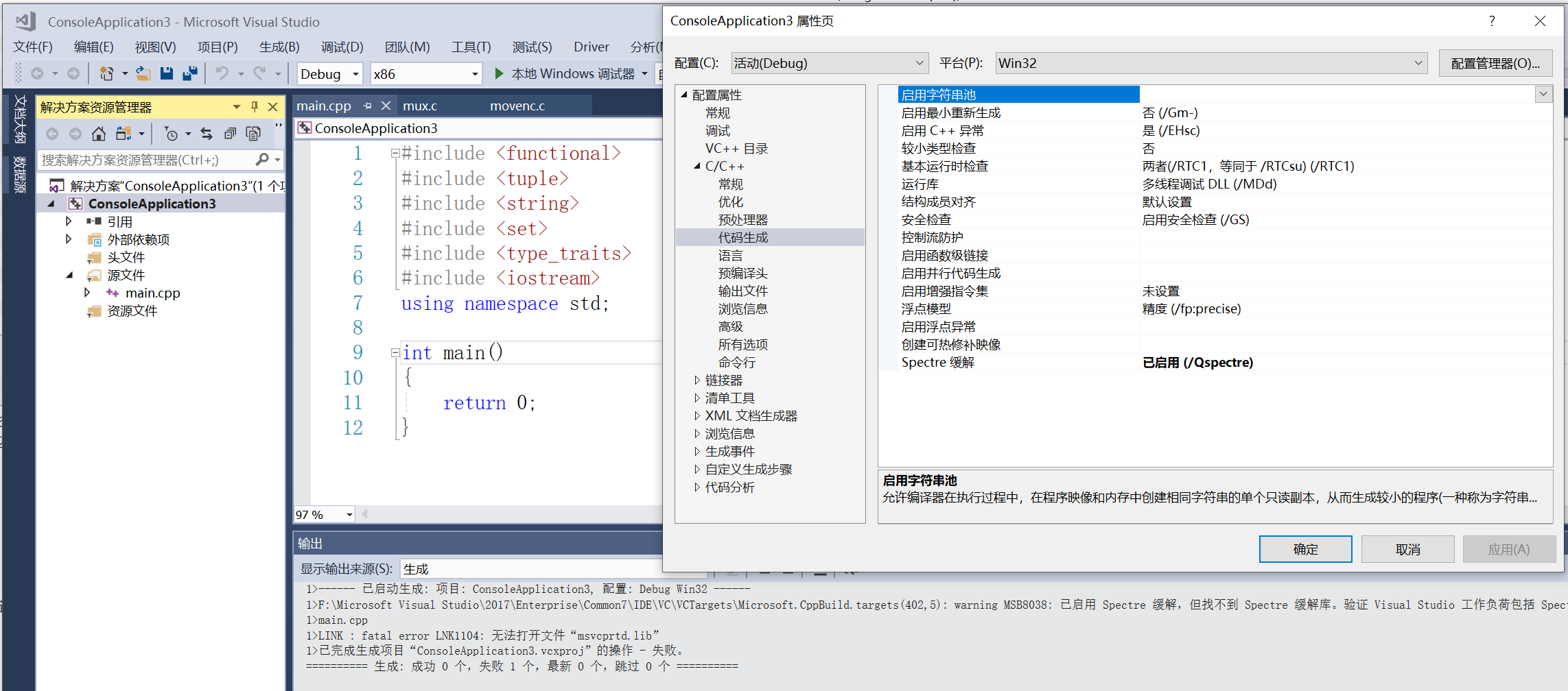 据说安装了WDK之后会有个bug导致Spectre缓解被默认打开了,如果没有安装带Spectre缓解的库,编译就会失败,如下图: