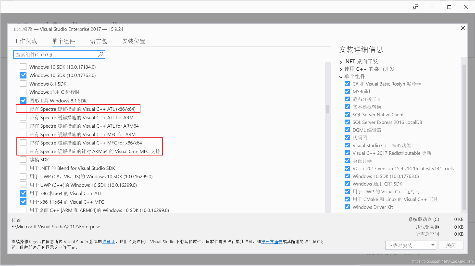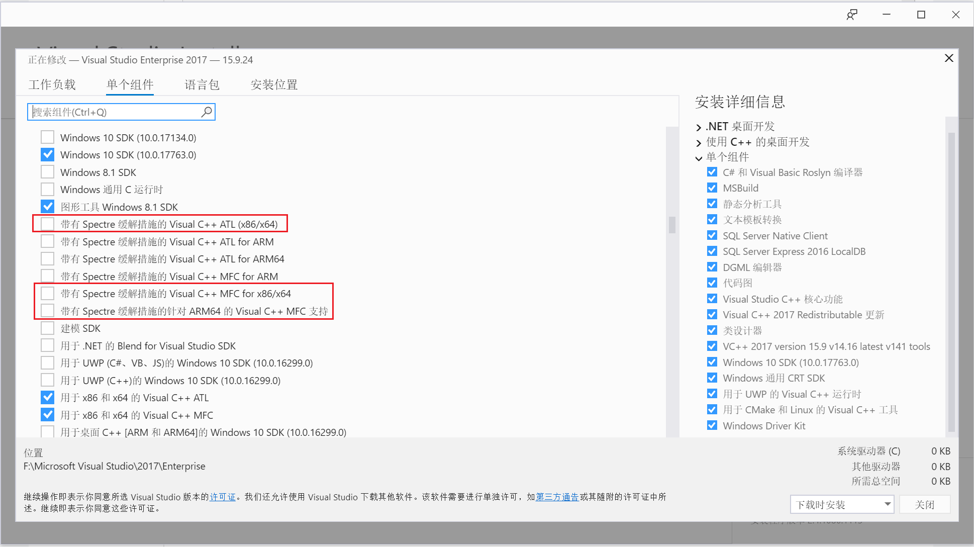 索性把安装带Spectre缓解的库,反正是缓解漏洞安全隐患的,装上实现Spectre缓解也不是坏事。直接在Visual studio Installer,点【修改】、【单个组件】里面就有带Spectre缓解的库: