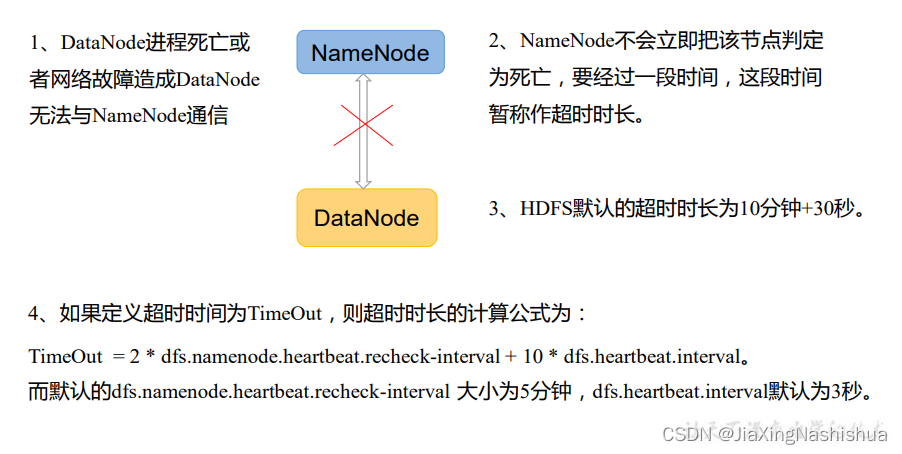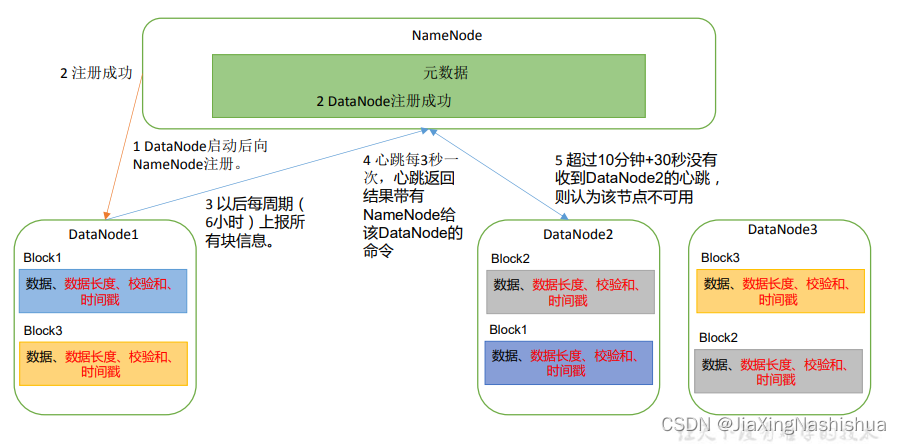 (3)心跳是每3秒一次,心跳返回结果带有NameNode给该DataNode的命令如复制块数据到另一台机器,或删除某个数据块。如果超过10分钟没有收到某个DataNode的心跳,则认为该节点不可用。
