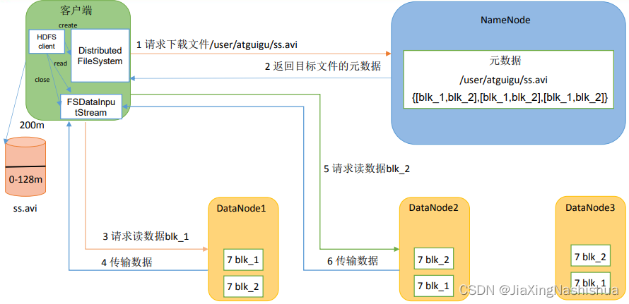 (1)客户端通过DistributedFileSystem向NameNode请求下载文件,NameNode通过查询元数据,找到文件块所在的DataNode地址。(请求下载)