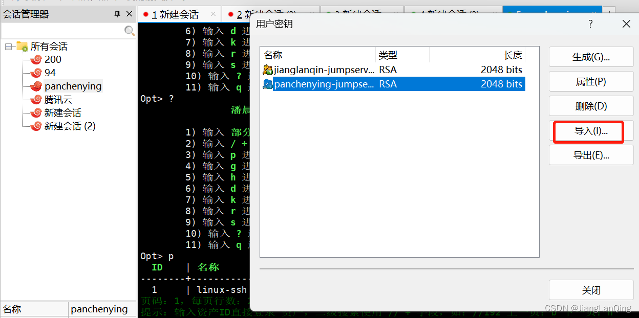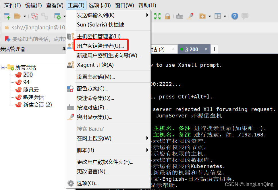 (2)使用xshell登录,需要页面设置一下,在页面工具处点击用户密钥管理者,将第一步获取的密钥输入。