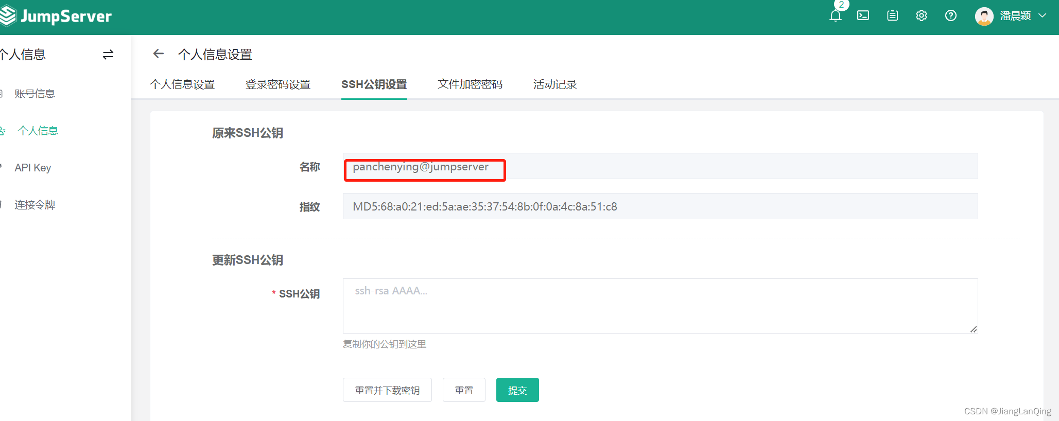 (1)先登陆到堡垒机页面,在账号的个人信息中点击重置并下载密钥,将密钥放在指定在英文目录下,因为终端连接的时候,要使用到密钥。为了防止找不到路径,所以我放在下载目录下。