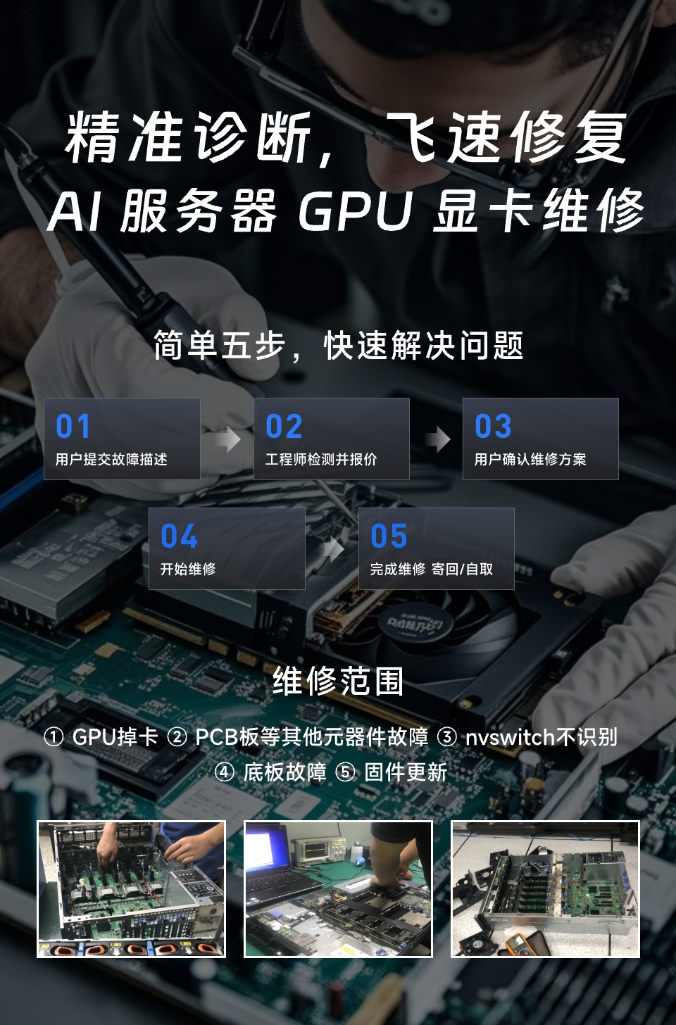 捷智算GPU维修室专注英伟达 GPU 维修,支持消费级、专业级及数据中心级 GPU,像 A100、H100、H800 等型号都不在话下。无论是显存故障、核心虚焊、供电模块损坏等物理损坏,还是显卡、模组、底板、链接器、PCB 版维修,都能精准修复,修复率高达95%。