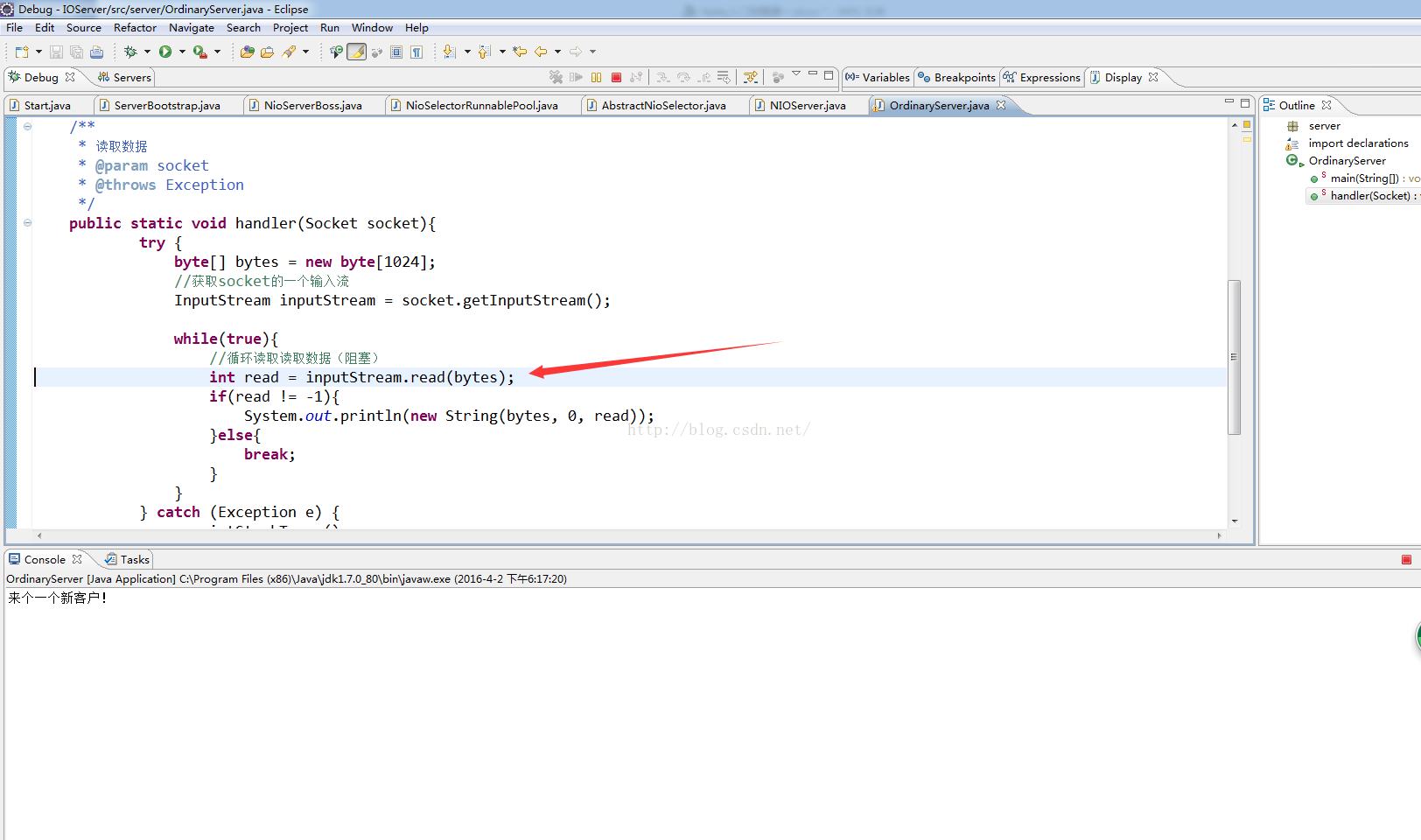 ,然后回车,发现代码往下执行了,哎哟发现int read = inputStream.read(bytes);执行到这一句就阻塞了