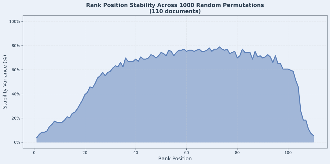 Y 轴 代表稳定性方差:可以理解为排序位置的抖动程度。0% 表示完美的稳定性,即无论输入顺序如何,同一个文档总是出现在该位置;100% 意味着该位置的文档极其混乱,几乎每次都被不同的文档占据。