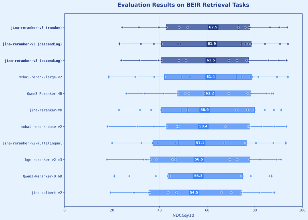 凭借这一高效架构,Jina Reranker v3 以小 6 倍的体量,在 BEIR 基准上取得 61.94 的 nDCG@10 分数,性能成功反超了 40 亿参数的 Qwen3-Reranker-4B。