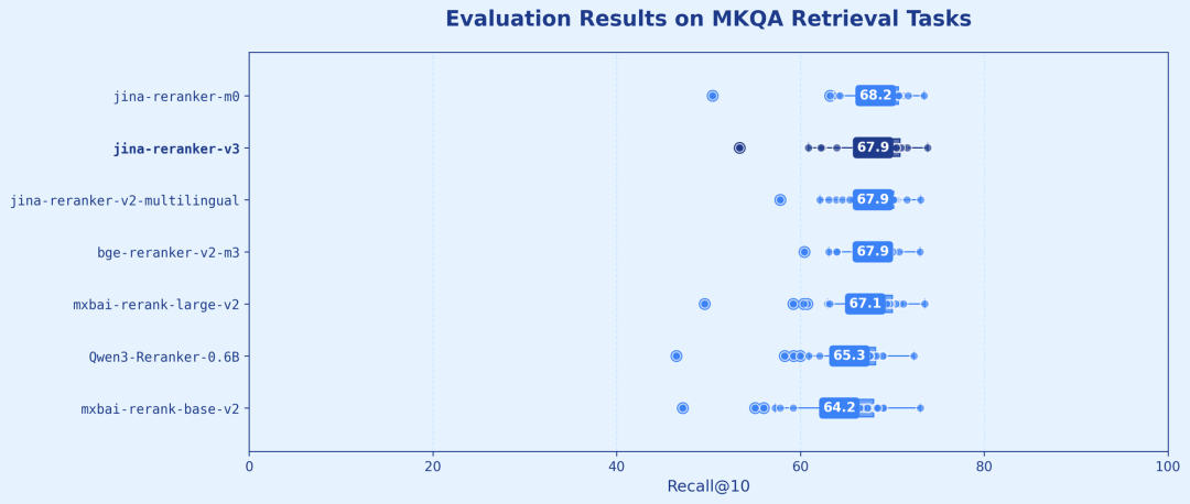 整个评测流程模拟了真实的两阶段检索场景:我们先用 jina-embeddings-v3 模型进行初步检索,抓取前 100 个最相关的文档,然后交由 Reranker v3 进行精排。