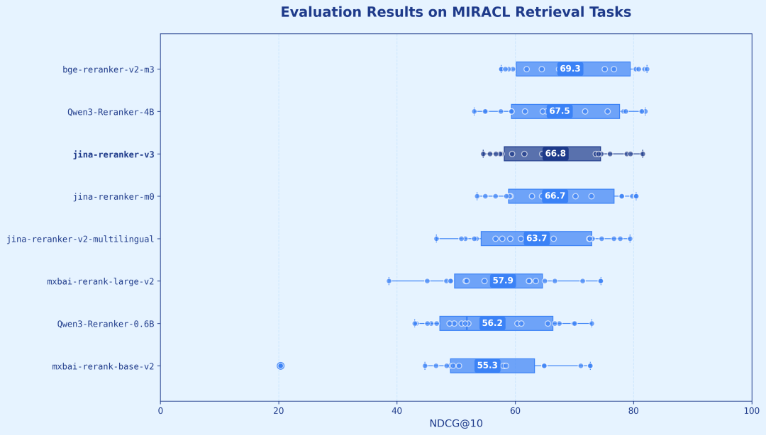 我们正式推出第三代重排器 Jina Reranker v3。它在多项多语言检索基准上刷新了当前最佳表现(SOTA)。