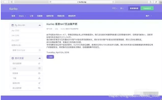 Kuriko2018年 4 月 24 日在其官网刊登香港 NAT 区故障声明,内容如下: