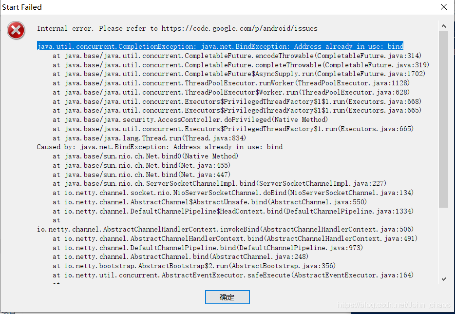 错误肯定是搜Exception, 原因是电脑端口占用,别的某个程序占用某个资源导致AS打不开。