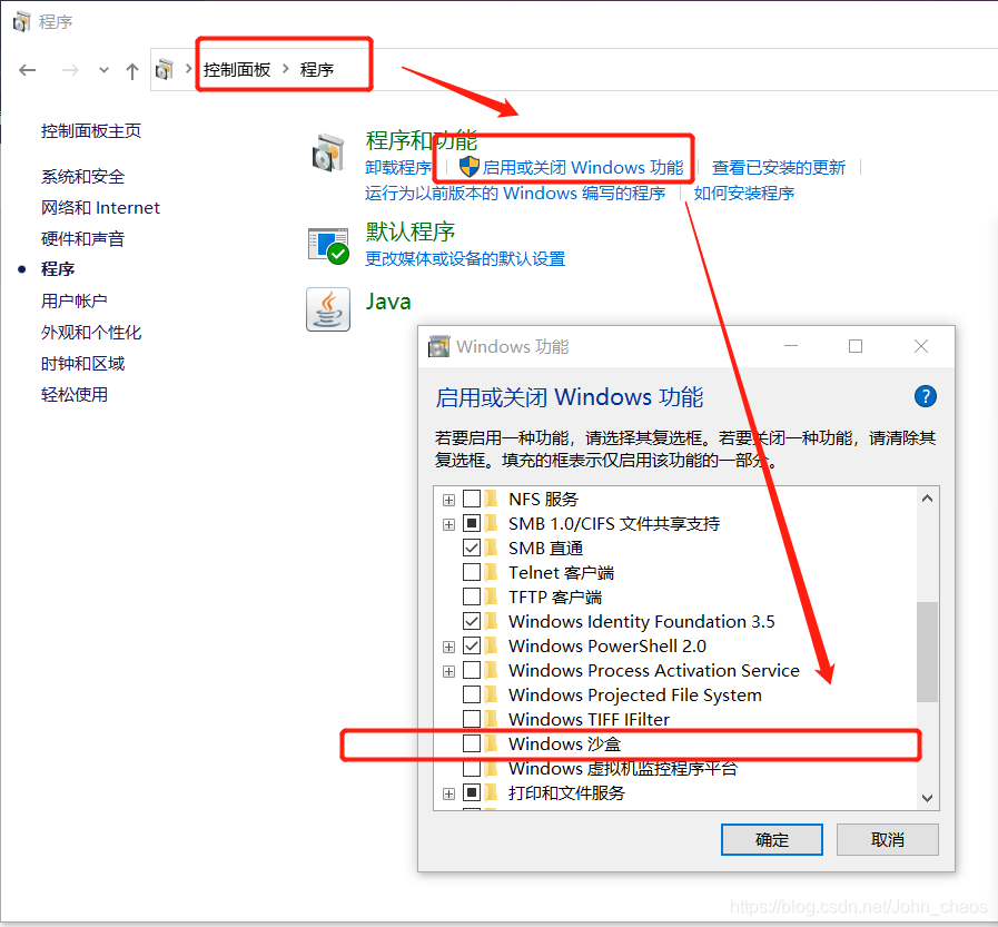 所以想下自己最近安装了什么程序,我一想,我最近升级win10旗舰版,打开了(Windows sanbox)沙盒功能。我赶紧去控制面板里把这玩意关闭了,然后重启电脑,问题解决了。