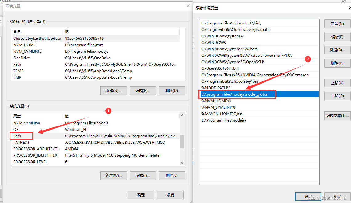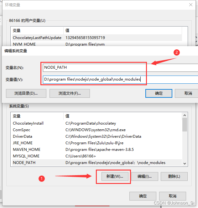 再在系统变量里新建一个 NODE_PATH ,在里面输入: