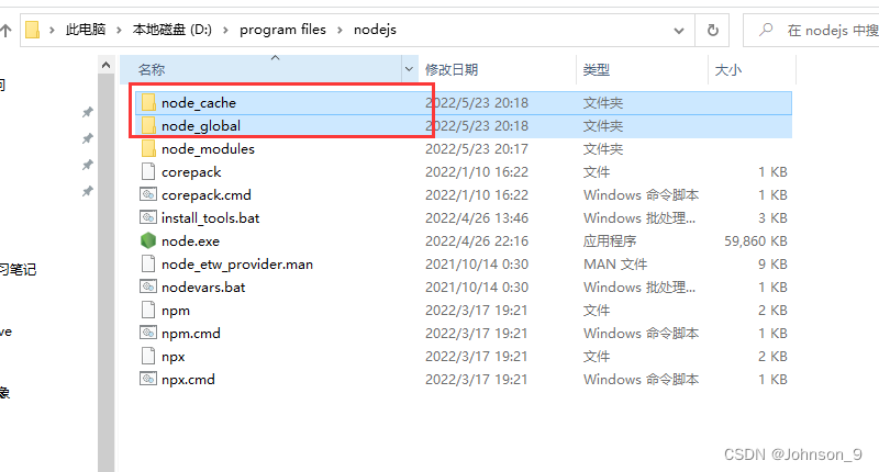 在配置之前先去检查node.js 文件中是否有 node_cache 和 node_global 两个文件夹,如果没有则创建。(一般来说都是没有的,需要自己创建)