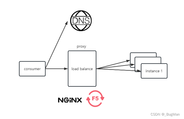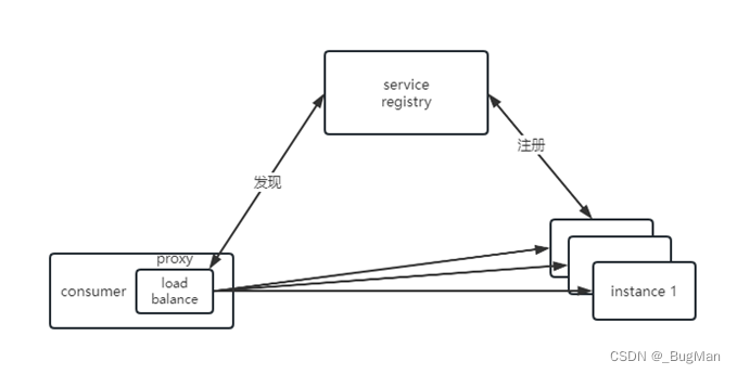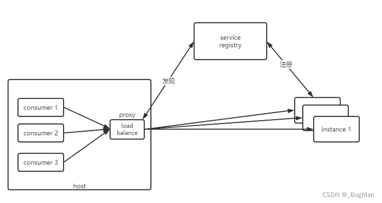 在服务消费者和服务提供者之间使用一个中间层来做代理,服务发现和负载均衡均由代理层来实现,消费者通过代理层来间接访问目标服务。
