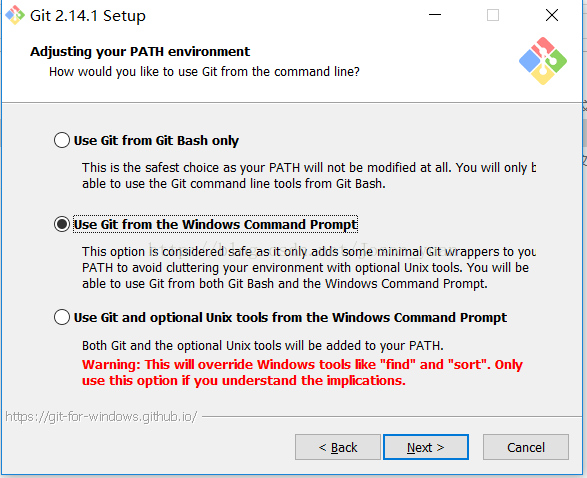 首先到网上下载Git的安装包,windows版本的下载地址如下:https://git-scm.com/download/win 。下载得到的文件是Git-2.14.1-64-bit.exe,然后双击安装它, 安装中的参数设置按默认来就好了,下图是安装过程中的一个界面,这里是让你配置环境变量,按默认选中间那个。