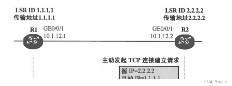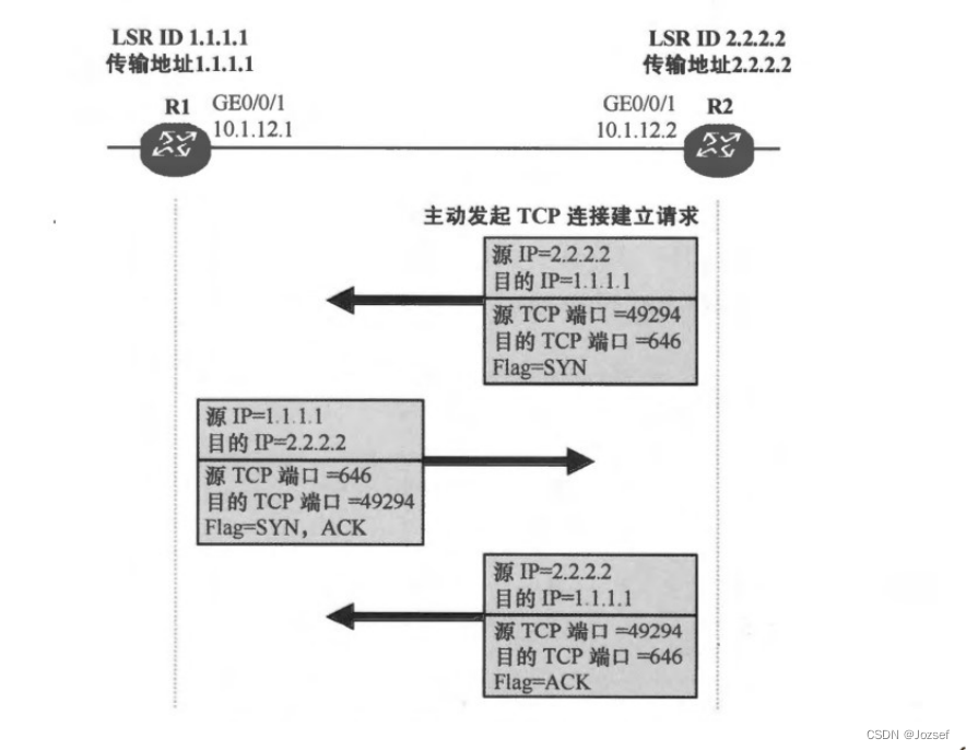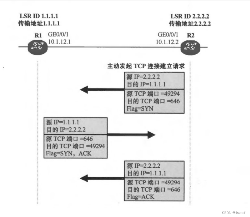 在建立TCP会话之间,LDP也存在检查动作,需要先确认收到的传输地址,在本地路由表中是否可达,可达则可以正常建立TCP会话。