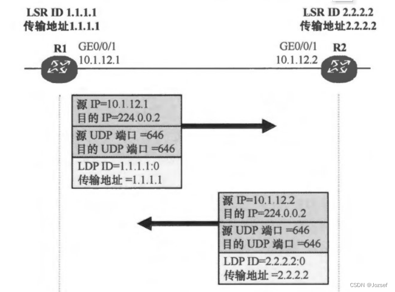 LDP协议在建立本地的LDP会话时,不需要手动指定邻居的IP地址,可以自动的发现邻居关系。主要是因为LDP首先会总过组播(2240.0.2)的形式周期性发送hello包来发现邻居。hello包使用UDP646端口来完成。