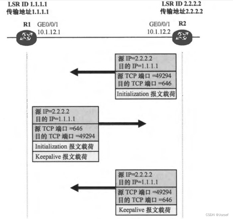 3,完成TCP会话建立之后,传递地址大的一方将优先使用初始化报文,里面包含一些协商的参数发给被动方。对方如果确认里面的参数,则将回复keeplive报文进行确认,同时发送自己本地的初始化报文,携带自己的参数。主动方收到后也将对参数进行确认,如果没问题则也将发送keeplive报文。双方都收到keeplive报文则代表参数协商成功,LDP会话建立成功。