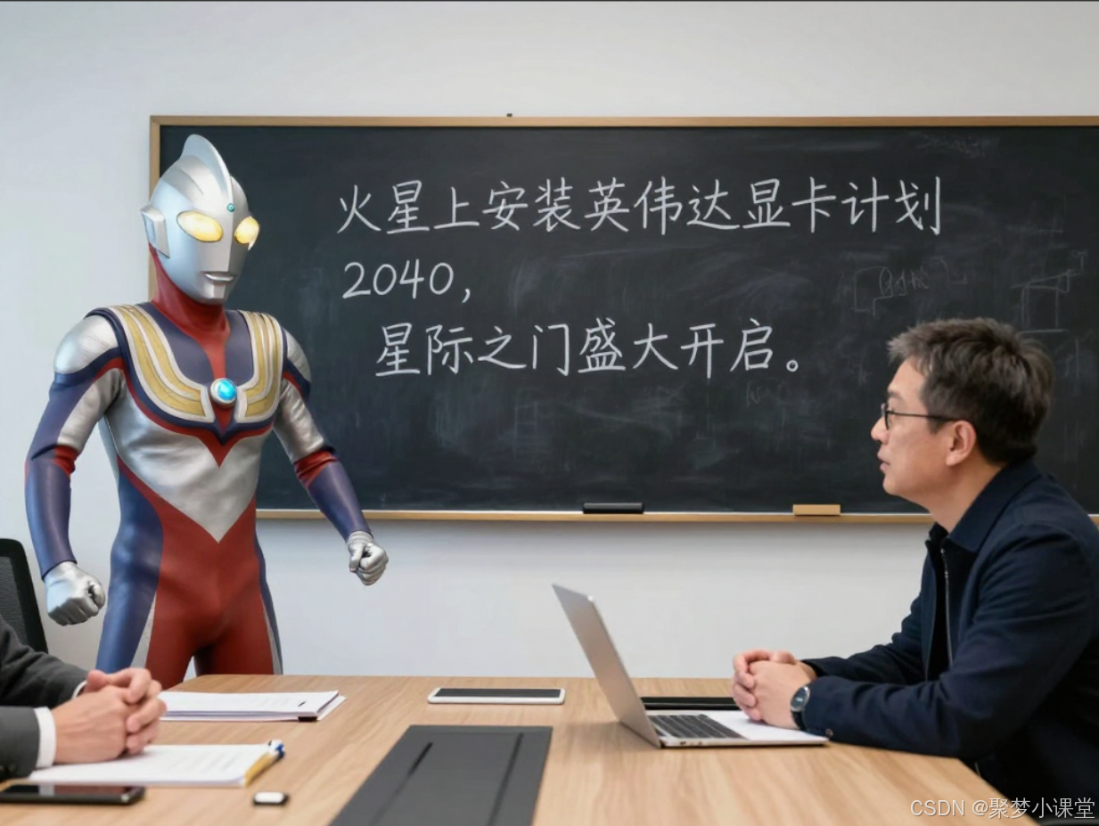 提示词: 在OpenAI内部的一次会议场景,奥特曼正在和黄仁勋讨论问题,黑板上写着“火星上安装英伟达显卡计划2040,星际之门盛大开启。”,写实照片,iphone拍照风格,