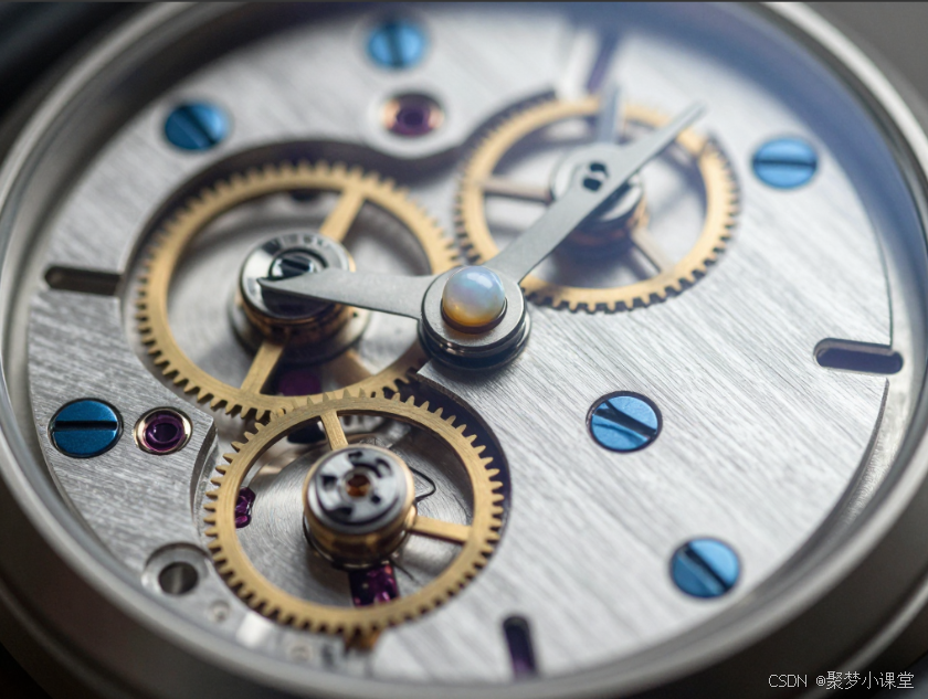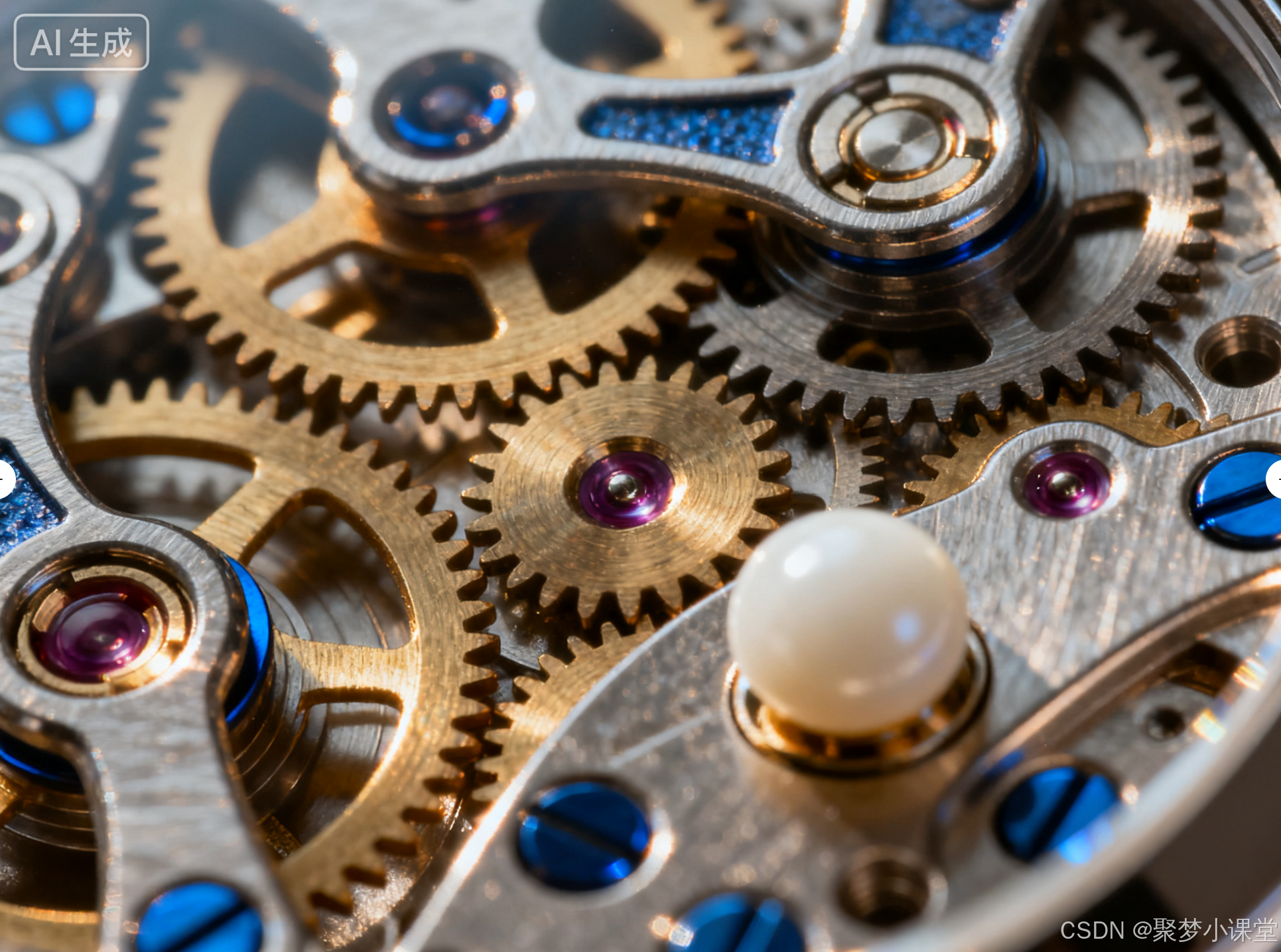 提示词: 一台精密的机械腕表内部机芯,齿轮交错,蓝钢螺丝,珍珠陀,特写镜头,充满细节,电影光效。