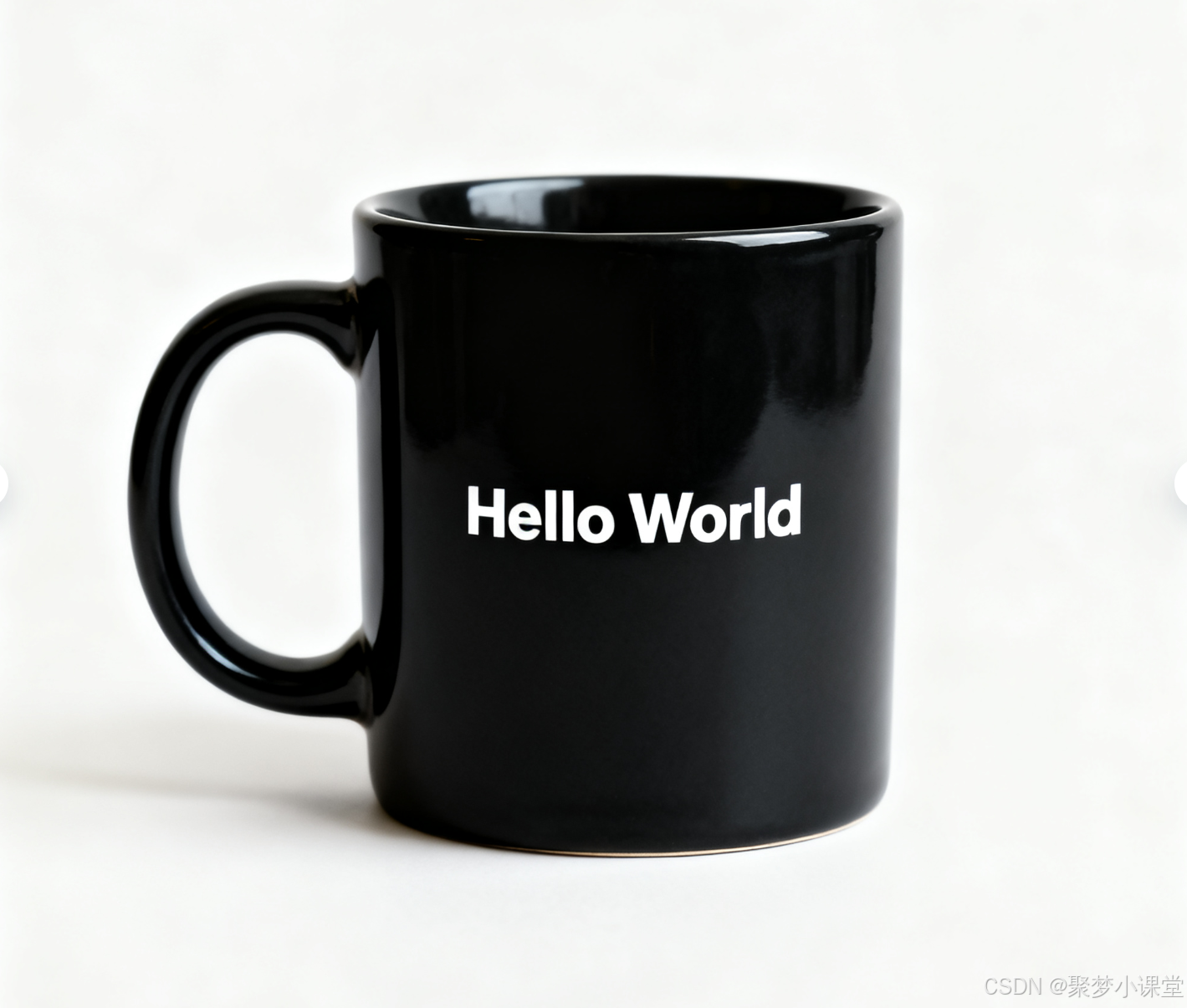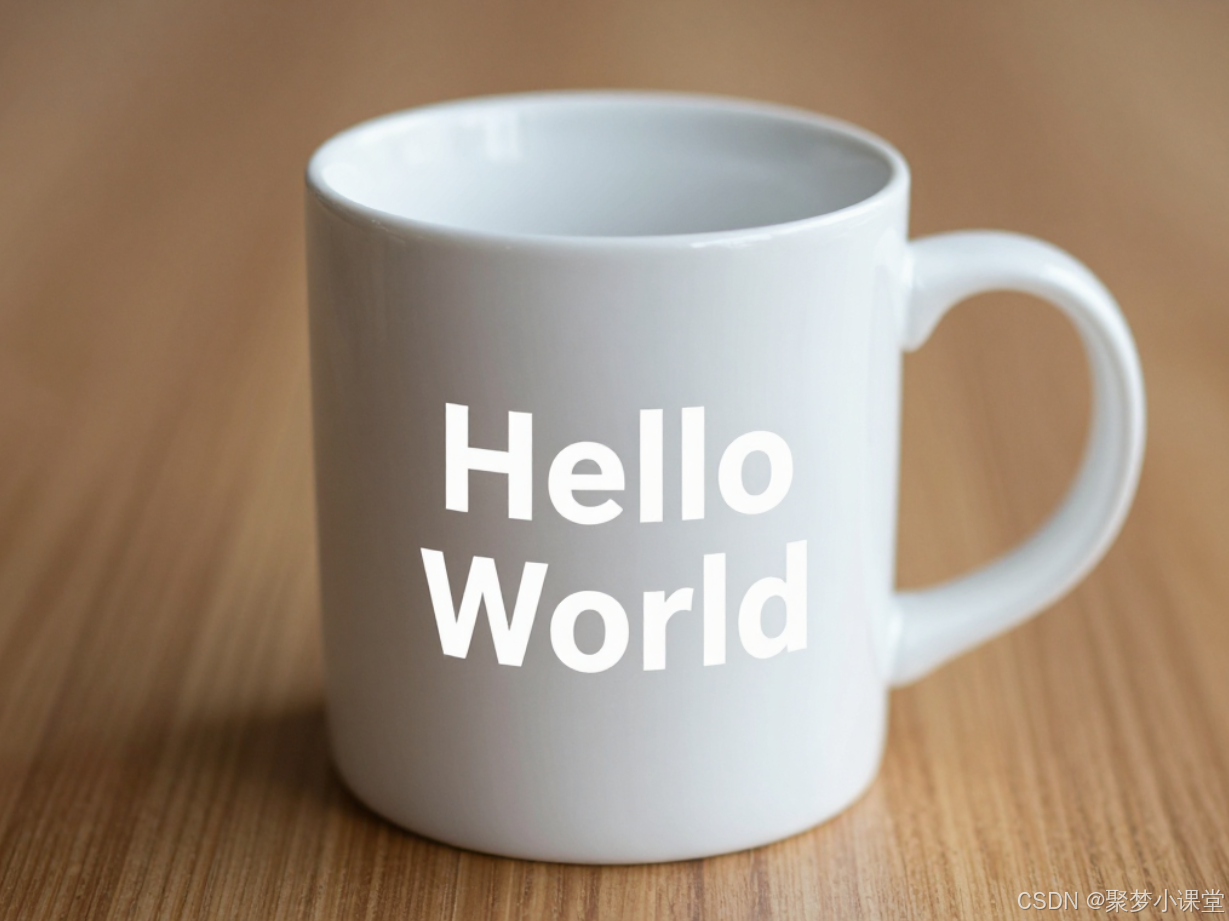 提示词: 一个干净的咖啡杯,杯身上写着白色的“Hello World”字样。