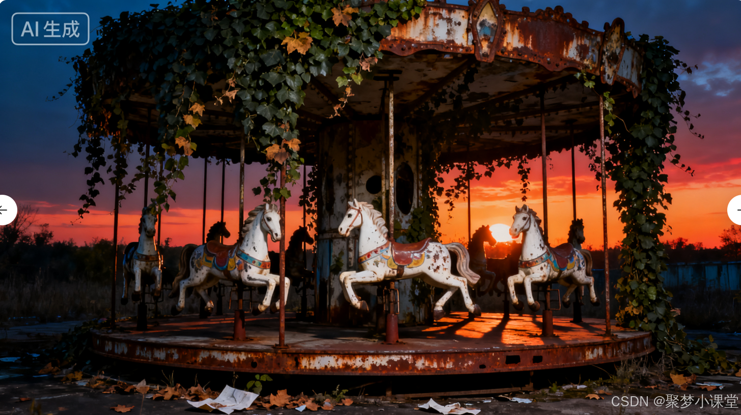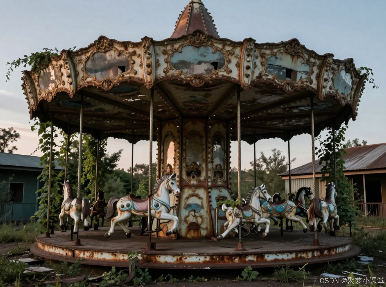 提示词: 一座被遗弃的游乐园,旋转木马锈迹斑斑,长满了藤蔓,黄昏时分,氛围宁静而忧伤。